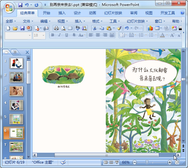 这是一个猴子末末反亲吻的运动故事。爱一个人有时候就是通过自己的行动来表达的,这份别再亲来亲去绘本故事ppt把爱就表现在亲吻上。对孩子们学会爱很有启发哦,欢迎前来东坡下载,帮助孩子们在爱中成长。