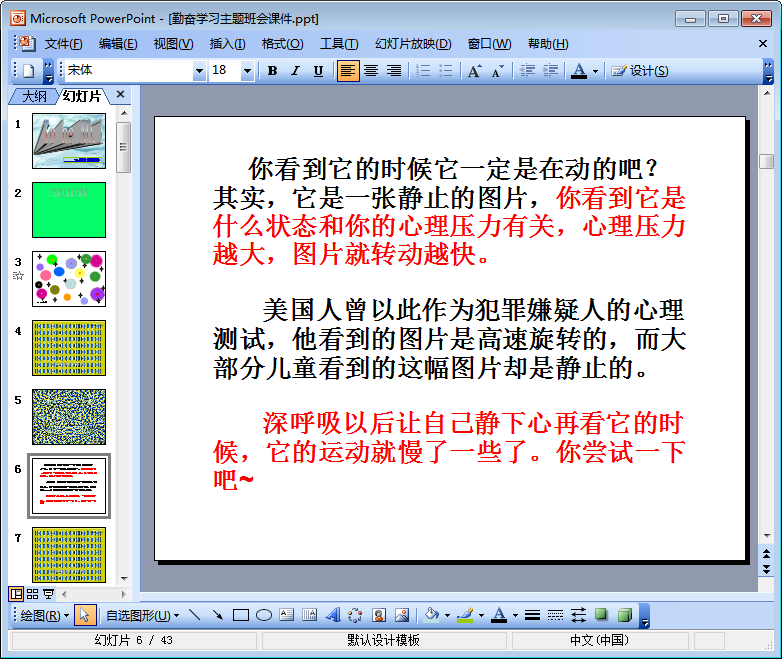 你看到它的时候它一定是在动的吧?其实,它是一张静止的图片,你看到它是什么状态和你的心理压力有关,心理压力越大,图片就转动越快。