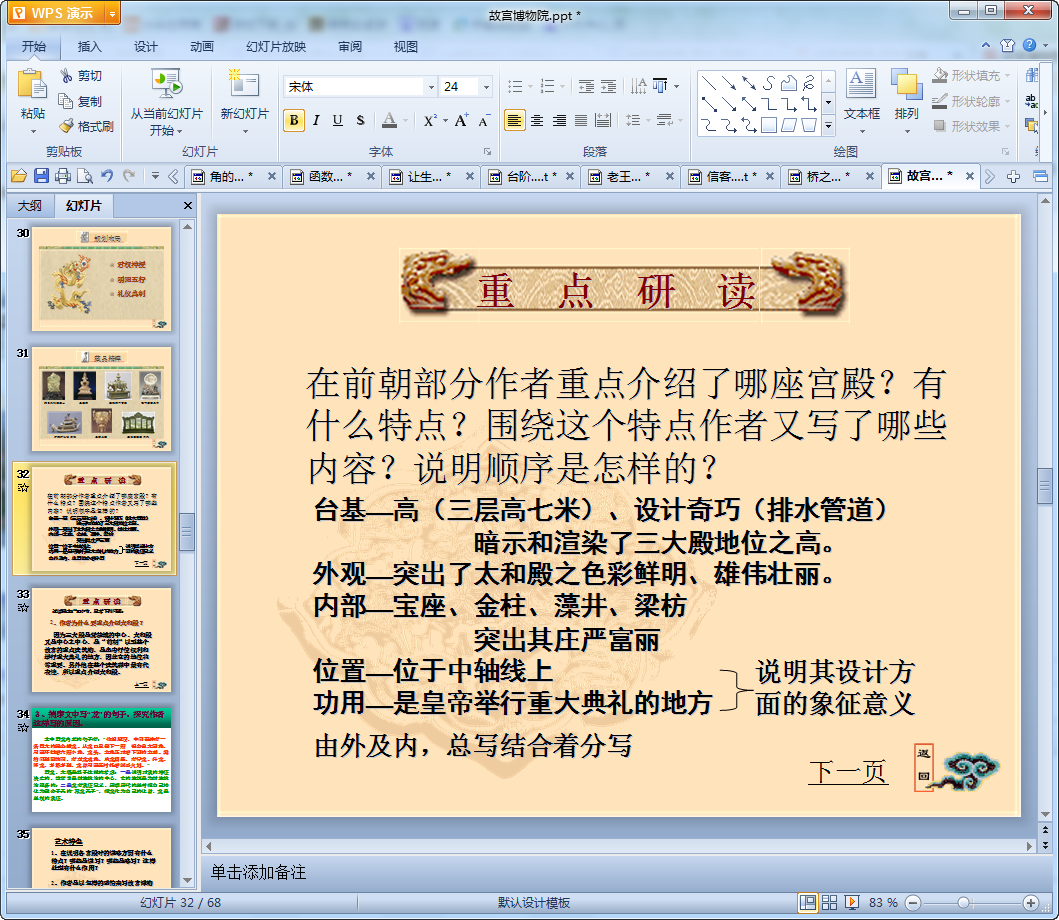 这是一篇语文课文故宫博物馆教学课件,课件中详细的讲解了课文,穿插了许多故宫的图片能让学生们能容易的了解课文学习课文,该ppt共有68页比较全面,有需要的老师们可以来下载使用!