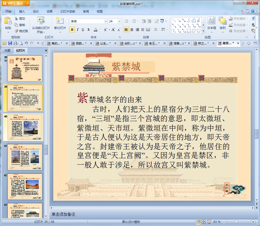 故宫又叫紫禁城,是明、清两代的皇宫。建成于明代永乐十八年(1420年),至今已有580年的历史。其间共有明清两代二十四位皇帝在这里行使最高权力。它位于北京市中心,占地72万㎡,有房屋8700间 。1961年,经国务院批准,故宫被定为全国第一批重点文物保护单位。1987年,故宫被联合国教科文组织列入“世界文化遗产”名录。故宫建筑群规模宏大壮丽,建筑精美,布局统一,集中体现了我国古代建筑艺术的独特风格。