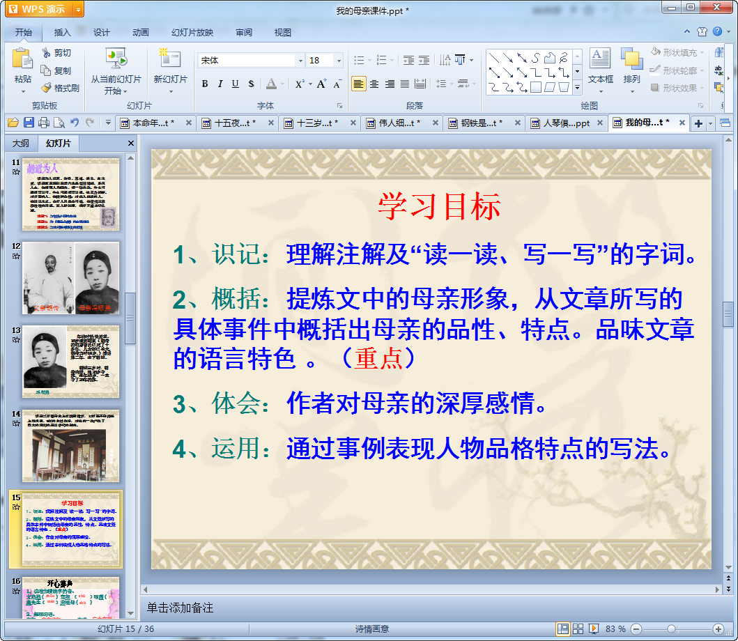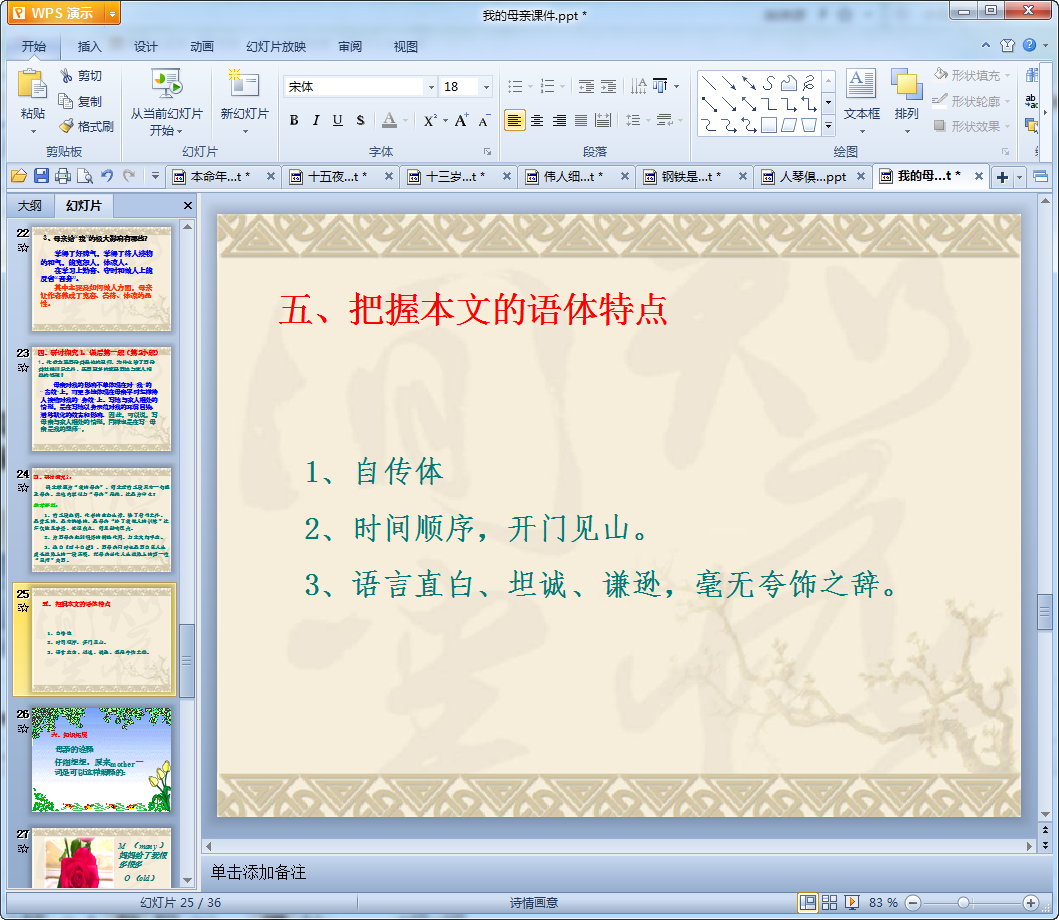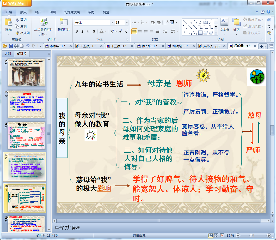 这是一篇语文课文我的母亲教学课件,文章中讲述了作者对母亲的怀念、感激、敬爱之情,该课件共有36页,喜欢使用ppt讲学的老师们可以来这边下载,不会让您失望!