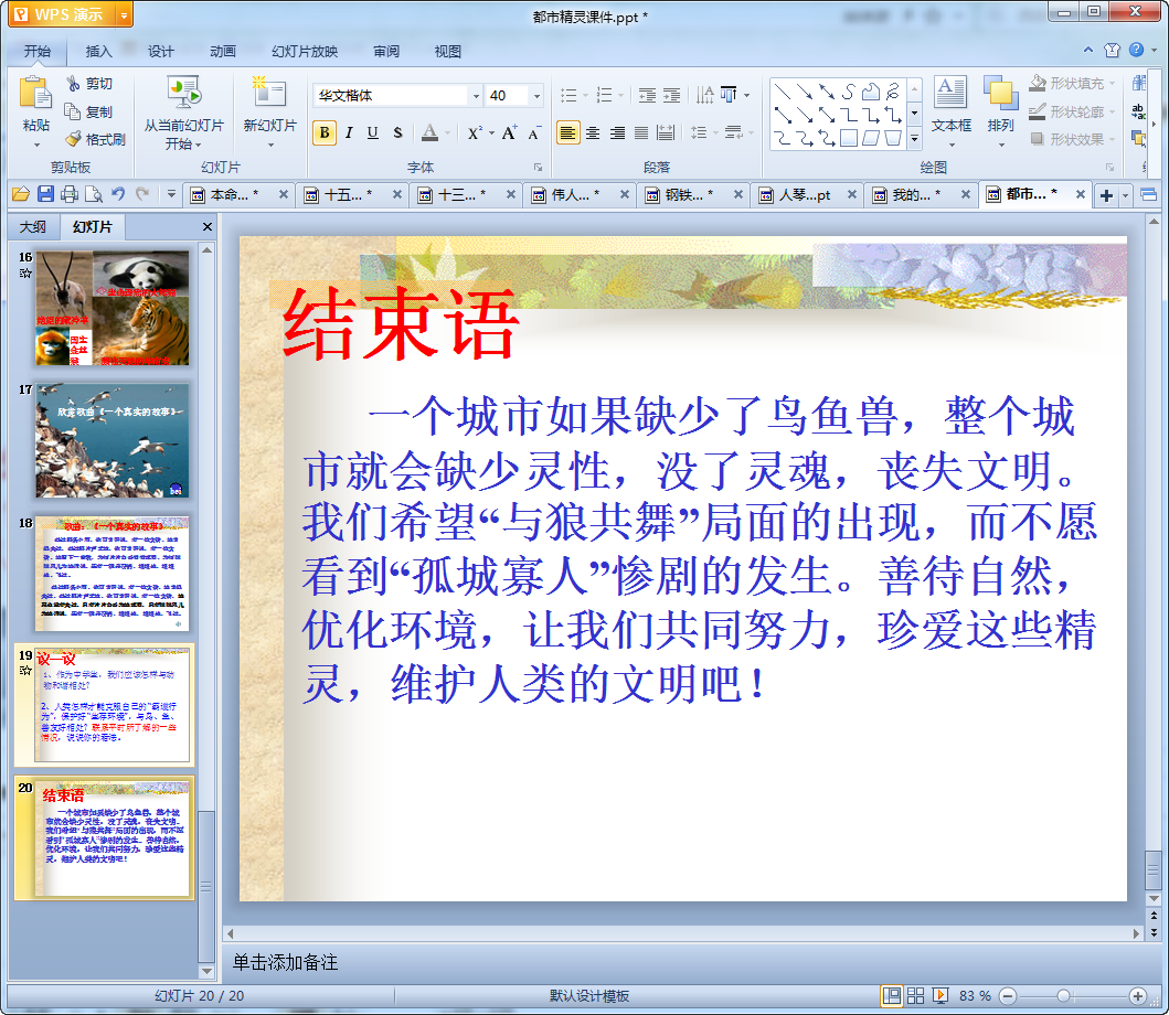 一个城市如果缺少了鸟鱼兽,整个城市就会缺少灵性,没了灵魂,丧失文明。我们希望“与狼共舞”局面的出现,而不愿看到“孤城寡人”惨剧的发生。善待自然,优化环境,让我们共同努力,珍爱这些精灵,维护人类的文明吧!