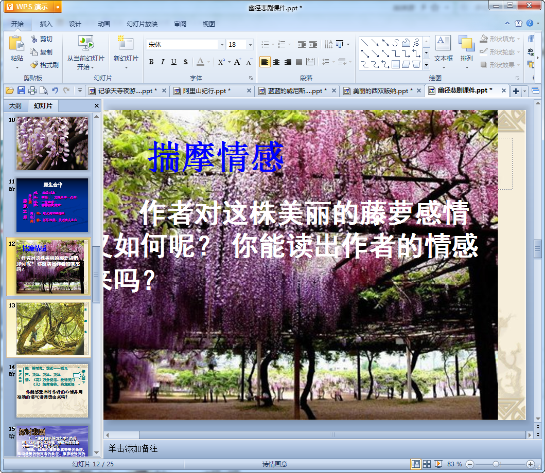 这是一篇语文课文幽径悲剧ppt课件,课件中介绍了季羡林以及大量的图片来讲解幽径之美藤萝之美以及“人类”的悲剧,让学生们更容易的理解课文,是一篇非常优秀的教学课件,有需要的可以来下载使用!