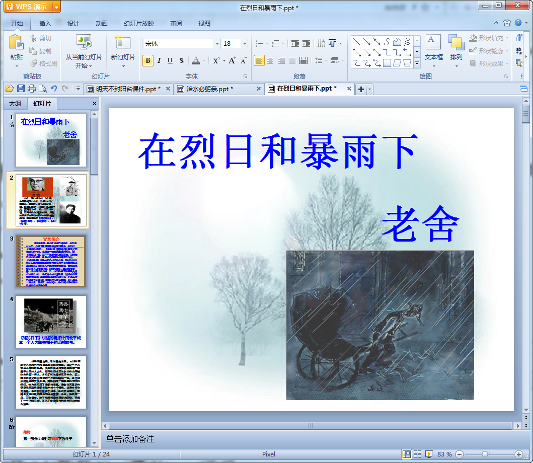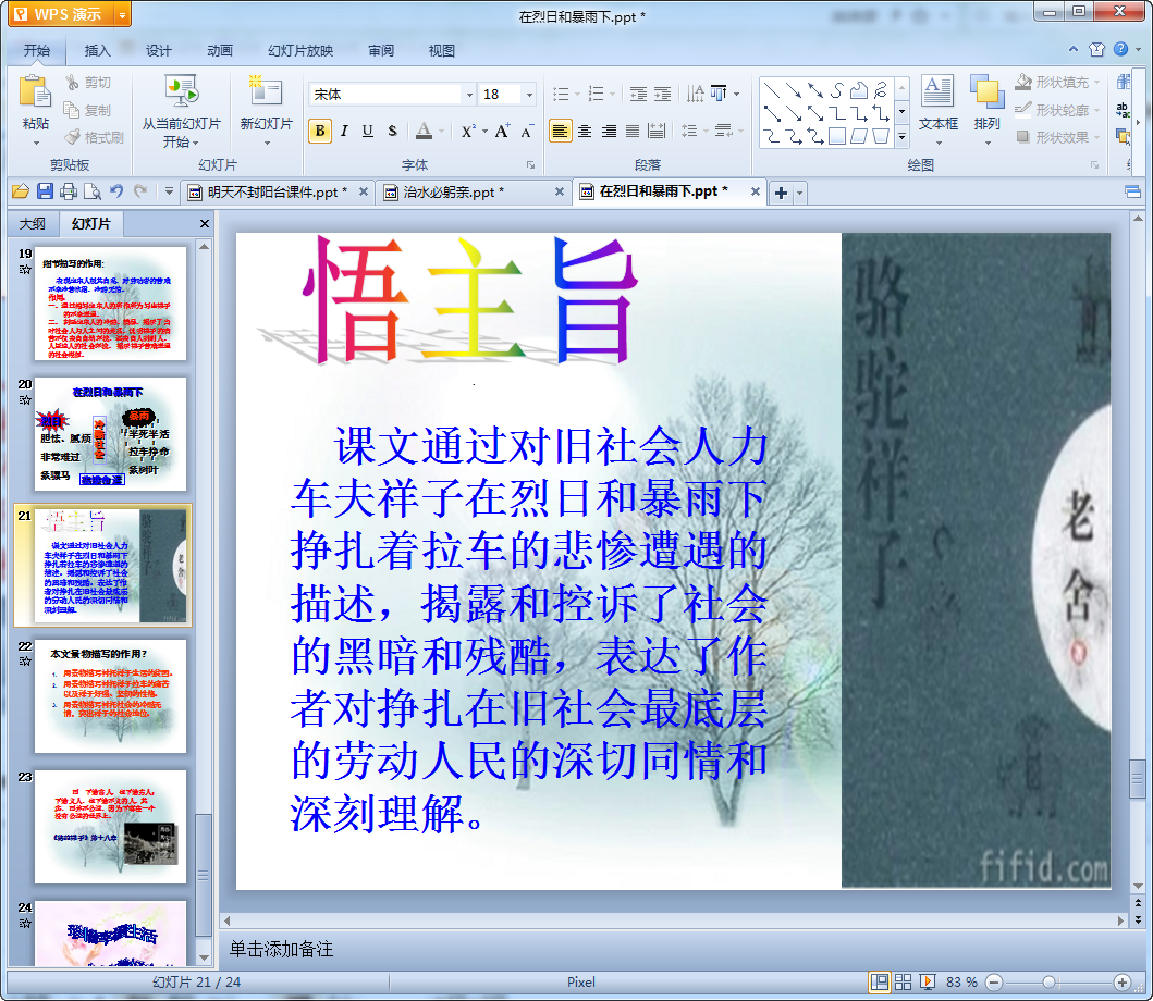 这是一篇语文课文在烈日和暴雨下ppt课件,课件中详细的解析了祥子在不同的天气状况下的不同的行李活动,能够让同学们更容易的理解课文的寓意,揭露了当时世道的黑暗以及底层劳动人民的艰辛,喜欢这篇课件的老师可以来下载!