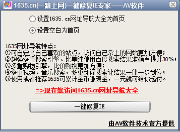 一键修复IE能使你的浏览器恢复到默认状态.还你绿色上网(目前唯一款可以删除恶意IE图标的软件),有需要的赶紧来下载使用吧。