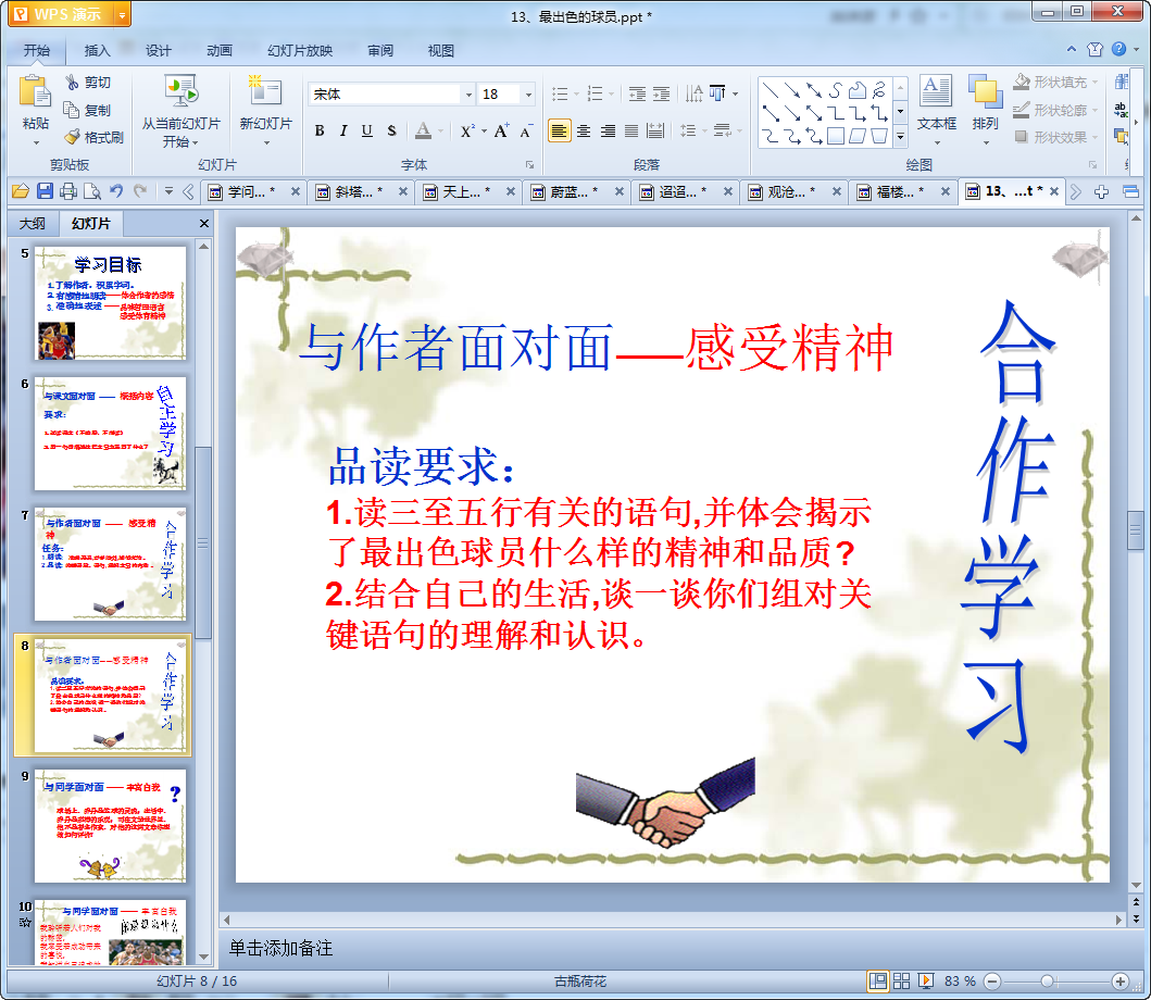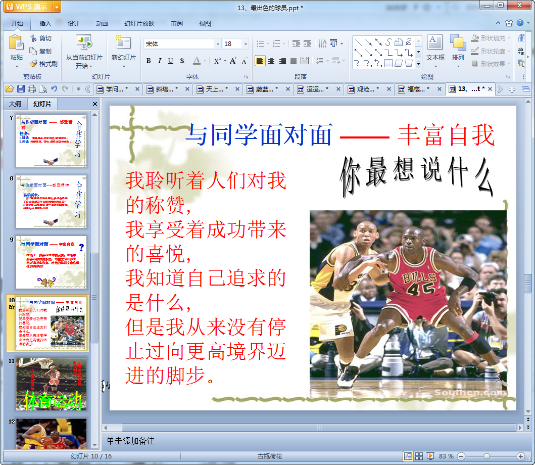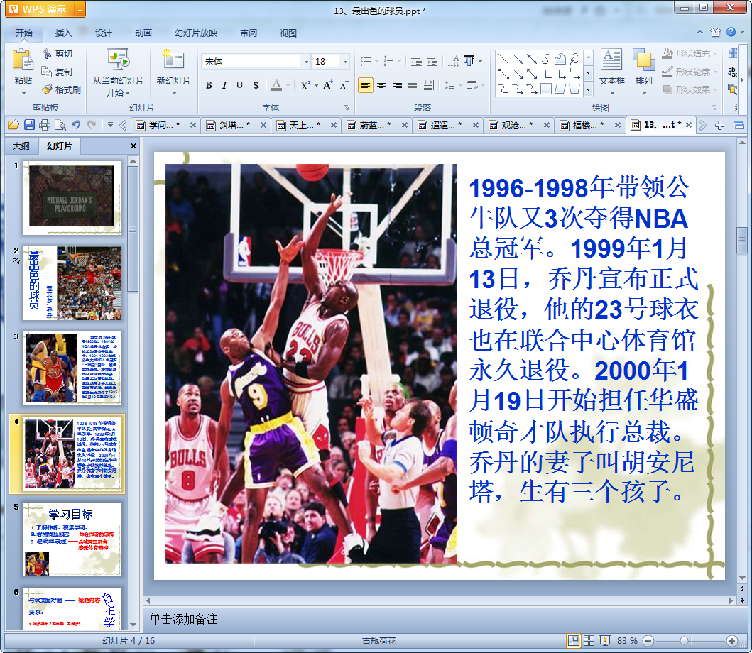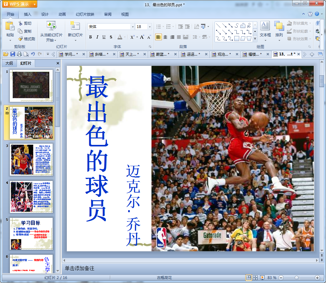 这是一篇语文课文最出色的球员教学课件,课文中讲述了迈克尔乔丹的篮球生涯,我们需要学习篮球队员的那种坚持努力为梦想而奋斗的精神,需要这篇课文的教学课件的老师们可以来这边下载使用!