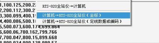 三、在仪器中选择“菜单”——“通讯”——根据所用的传输方式选择不同的模式,一般使用的方式为“1.通过串口”——“接收坐标”——点击“确认”——最后点击“开始”仪器将开始等待接收数据。在电脑软件中操作“通讯”——“计算机 RTS-820全站仪(坐标)”然后点击确定等待数据传输即可。如下图: