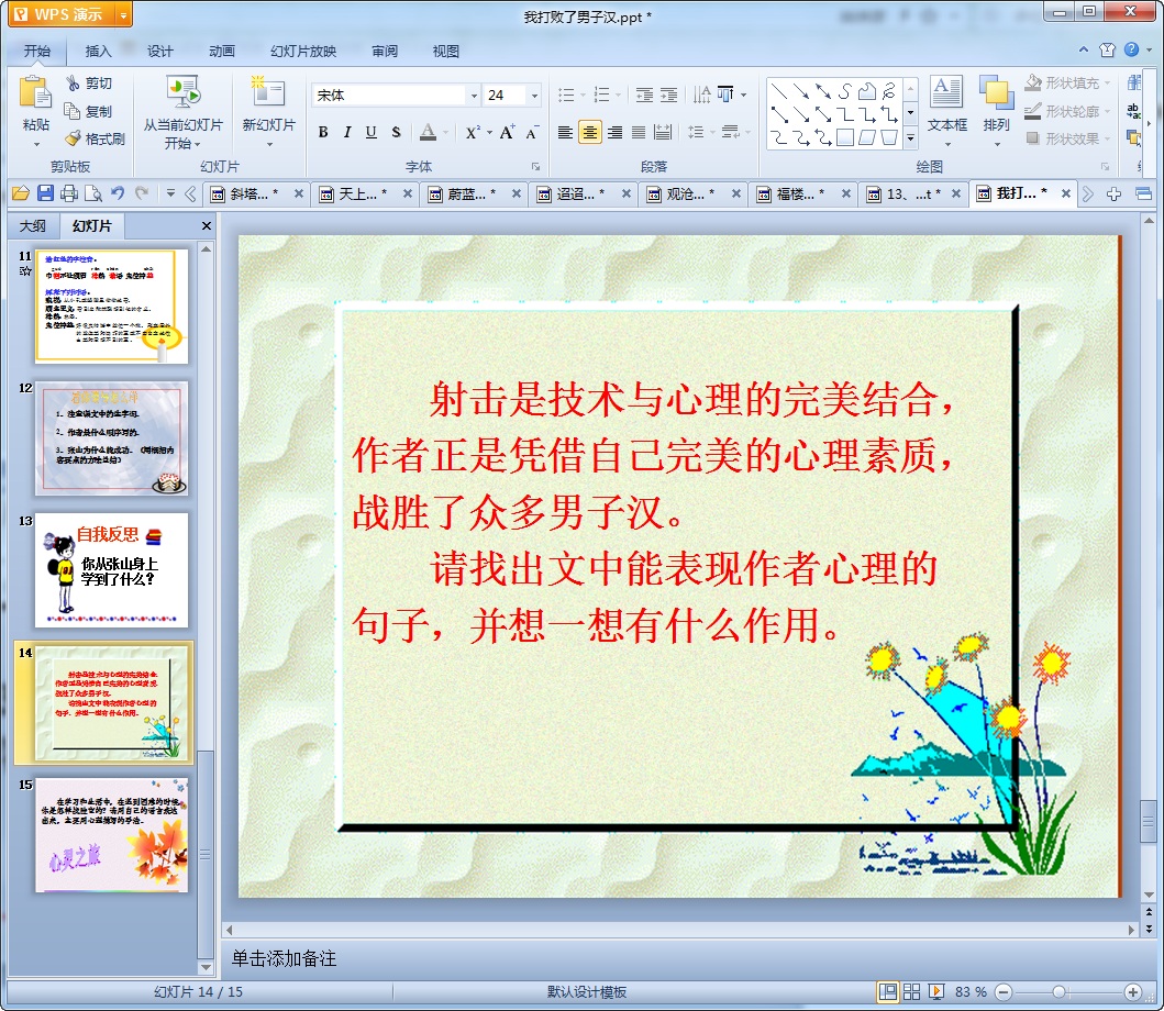 射击是技术与心理的完美结合,作者正是凭借自己完美的心理素质,战胜了众多男子汉。请找出文中能表现作者心理的句子,并想一想有什么作用。