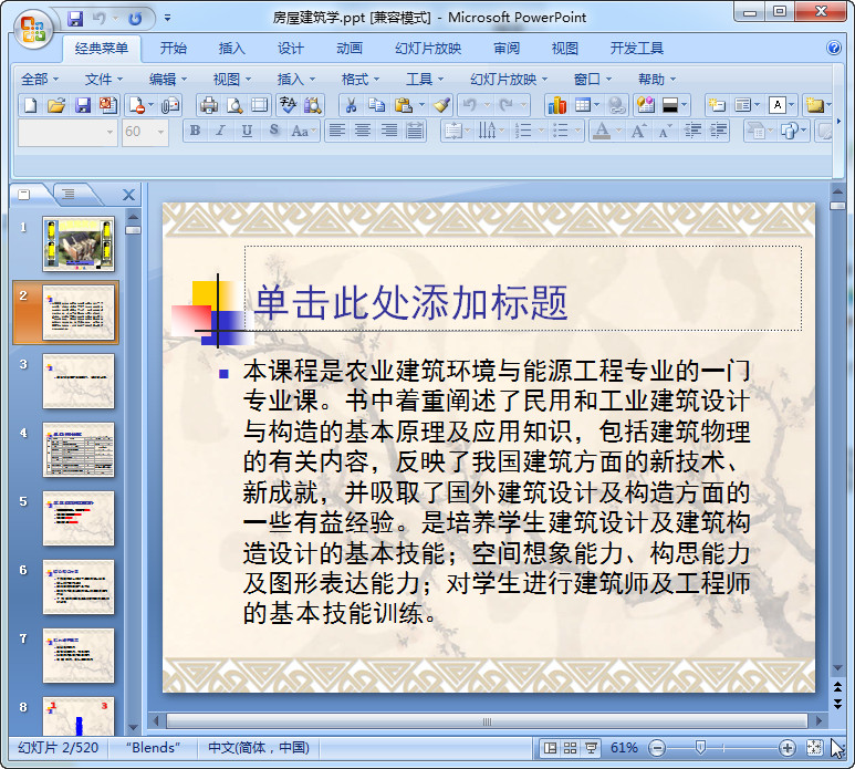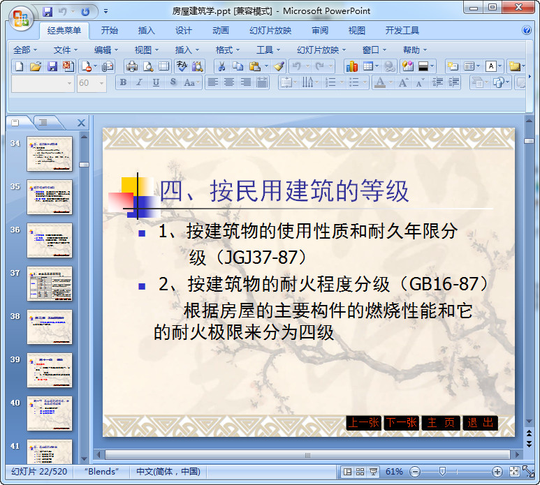 房屋建筑学ppt课件总共有520页,是根据教科书房屋建筑学设计而来的。里面每一章的ppt课件都有,分别划分为不同的版块,还有建筑设计图等内容。欢迎有需要的伙伴前来东坡下载使用!