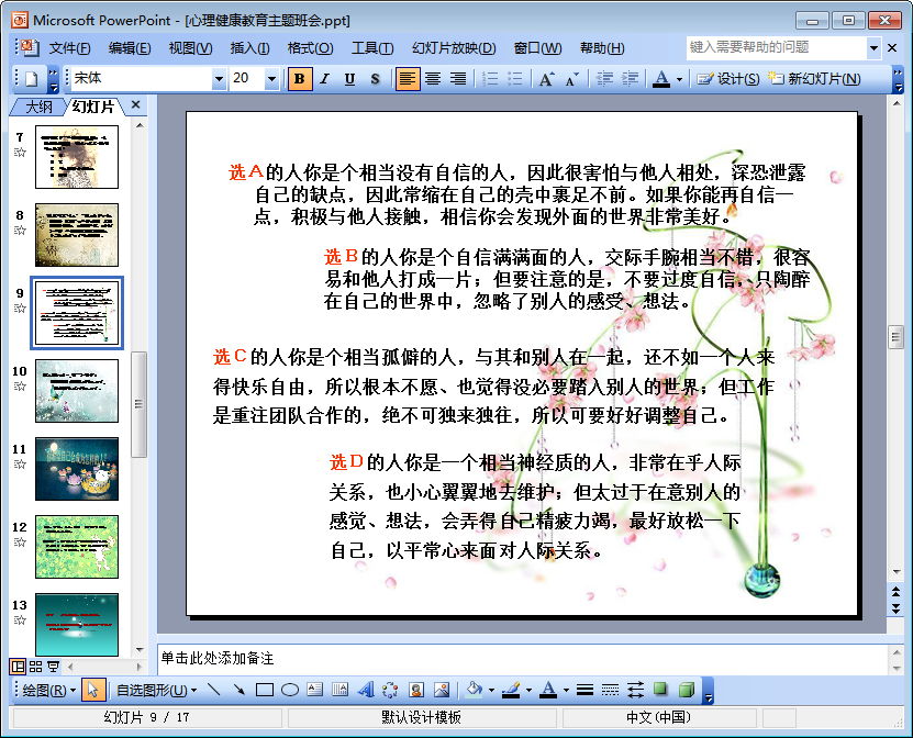 该心理健康教育主题班会课件ppt共由17页组成(以下简称为心理健康班会ppt),除了具有教育引导性的文字内容之外,该ppt内容中还包含有很多心理测试题哦!十分具有趣味性,下文是该ppt课件的内容摘选及预览图,需要下载该ppt的朋友们只需轻轻点击本文相应的下载地址进行下载即可!
