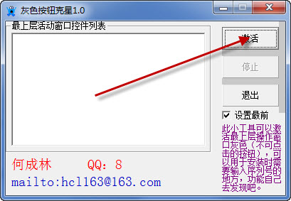 灰色按钮克星是一款将无法点击的灰色按钮激活使用的软件,灰色按钮克星能轻松打开未注册或者功能已经被限制了软件,还可以让隐藏起来的按钮显示出来,现在,好多软件在安装时要输入序列号才能继续,也就是说,你不输入序列号,则“下一步”这个按钮是灰色的,使你无法点击它,现在好了,使用本程序,单击“激活”。