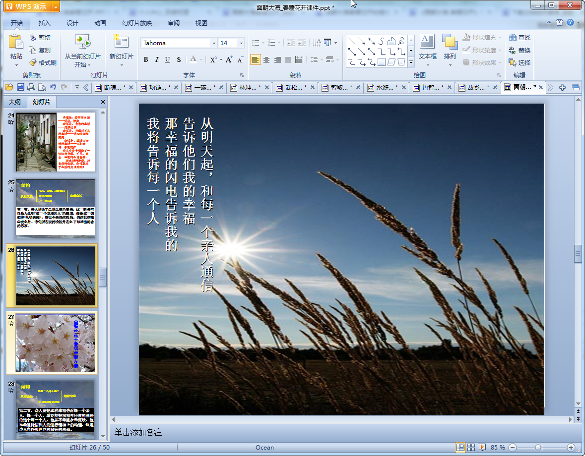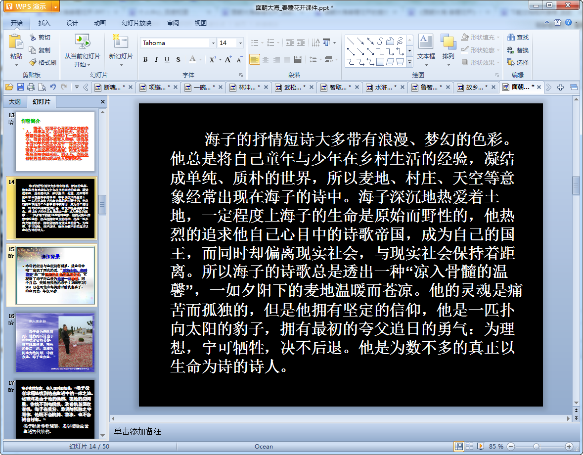 这是海子的一篇文章面朝大海春暖花开教学课件,该课件共有50页,内容丰富文章解析详细再加上精美的图片深受广大老师们喜爱,有兴趣的老师们可以来下载使用!