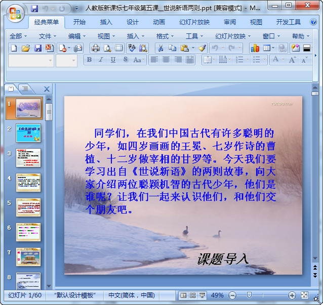 世说新语两则ppt优秀课件里面总共有两则,一则是咏雪,一则是陈太丘与友期。总共有57页,非常的精彩。欢迎前来东坡下载使用!