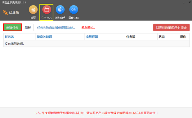 首先打开淘宝盒子无线版,登陆您的账号,点击任务中心,然后新建任务。