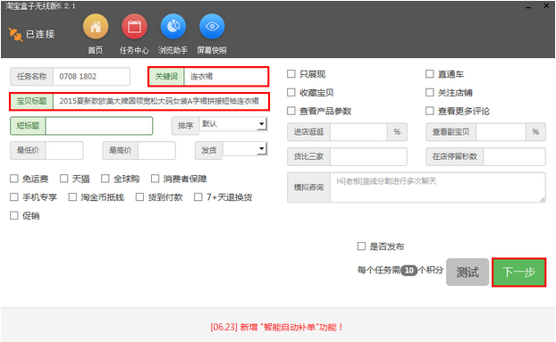 您有连接手机的话可以测试任务,测试没问题点击下一步设置点击量。