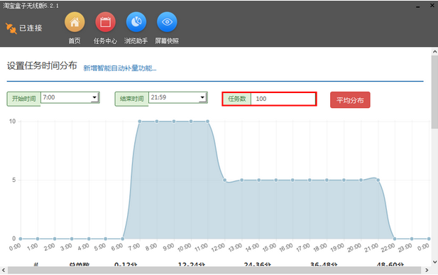 假如您每天需要100人搜索,就把任务数设置为100,点击平均分布;