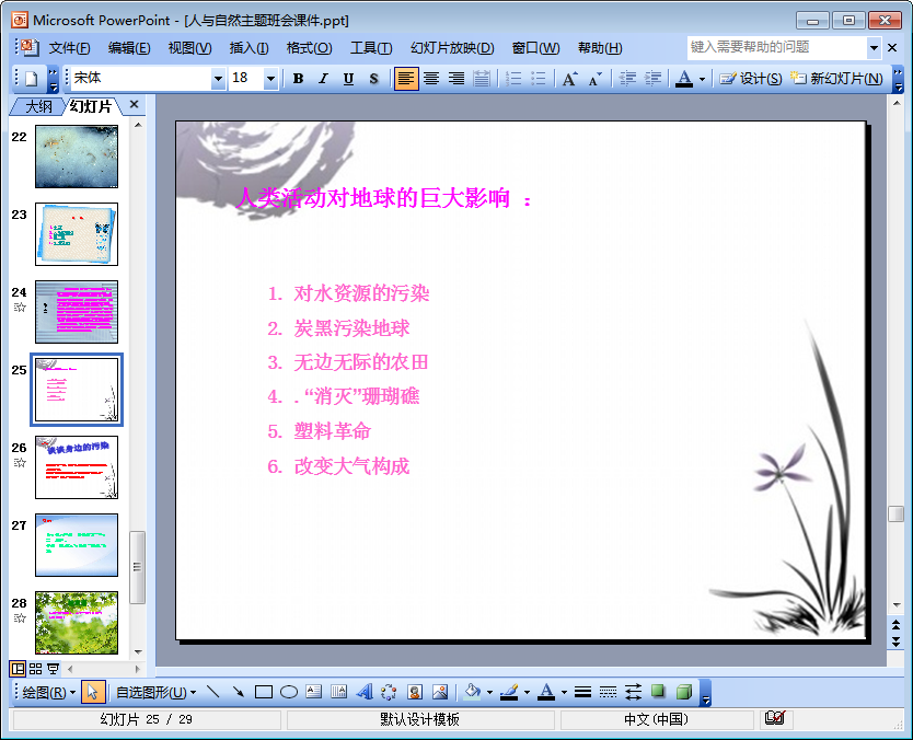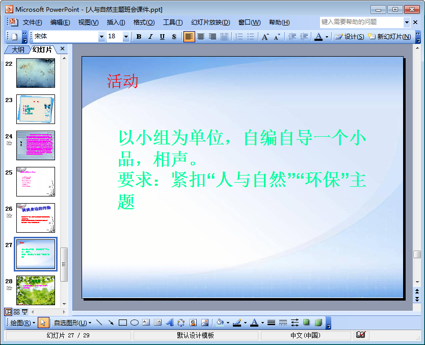 这是一份主题为“人与自然”的ppt,适合作为小学阶段的班会课件进行选取使用。该ppt共由29页组成,需要人与自然ppt资料或是人与自然ppt文字的朋友们可以参考一下!下文是该ppt的内容摘选及预览图,相信你会喜欢的!