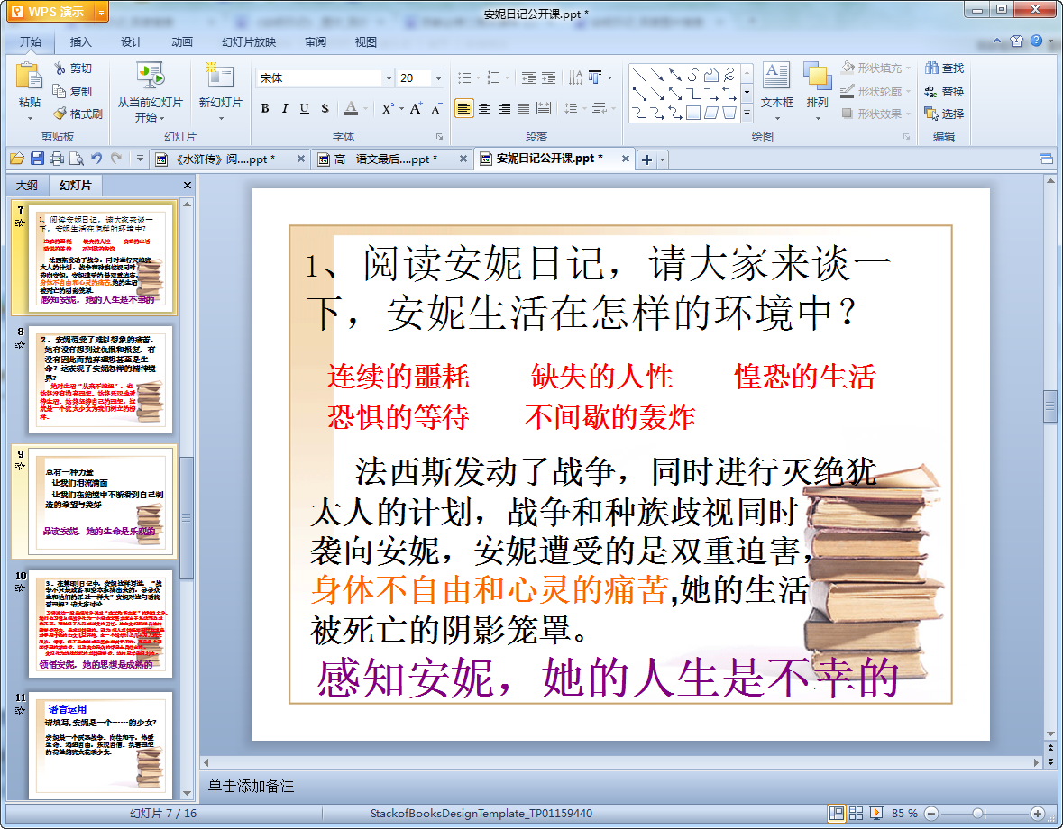 法西斯发动了战争,同时进行灭绝犹太人的计划,战争和种族歧视同时袭向安妮,安妮遭受的是双重迫害,身体不自由和心灵的痛苦,她的生活被死亡的阴影笼罩。