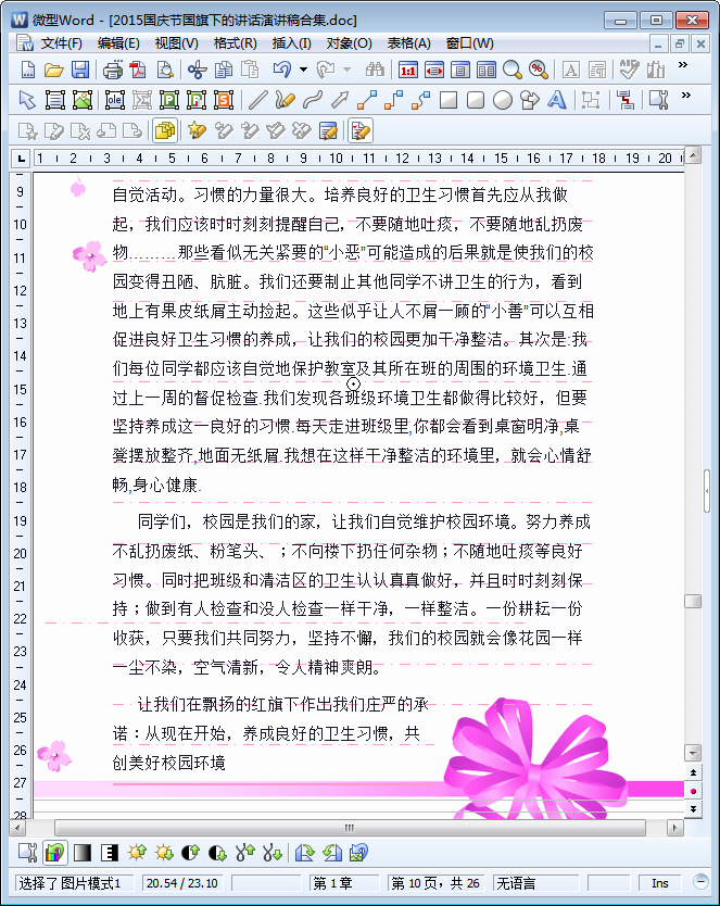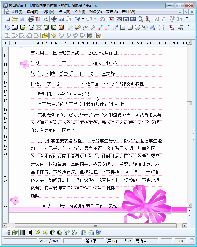 这份2015国旗下的讲话演讲稿合集中包含有多篇演讲稿,包括养成良好的习惯演讲稿、为他人着想、共同创造文明有序的环境、成功来自勤奋付出终有回报、养成良好卫生习惯共创美好校园环境演讲稿等,有需要国旗下的讲话稿或是国旗下的演讲稿的朋友们可以下载下来参考一下!