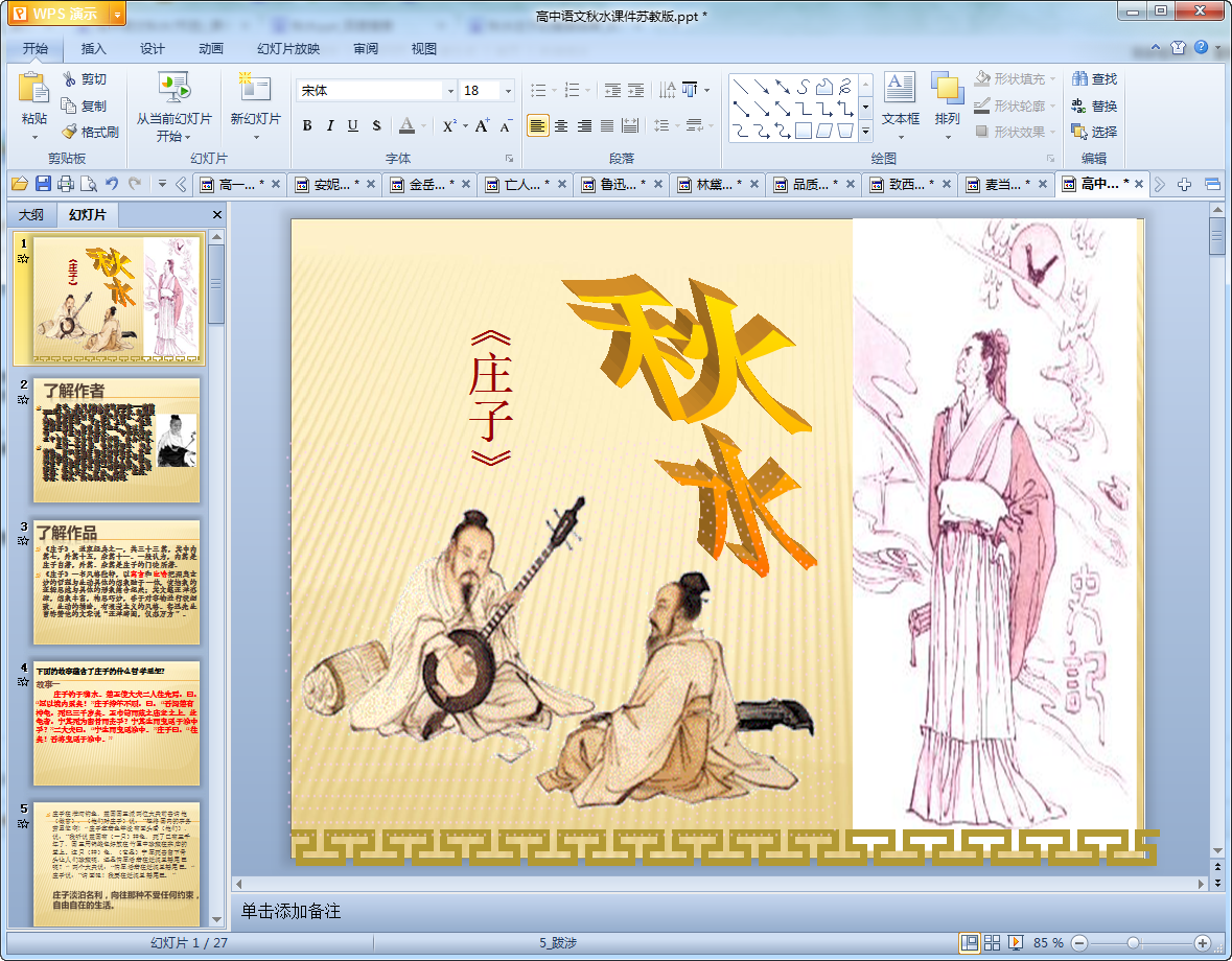 这是一篇语文课文秋水ppt课件,课件中介绍了庄子的生平经历以及作品,对文章中的知识点也都讲解的十分详细,需要这篇课件ppt的老师们可以来这边下载使用,不会让您失望!