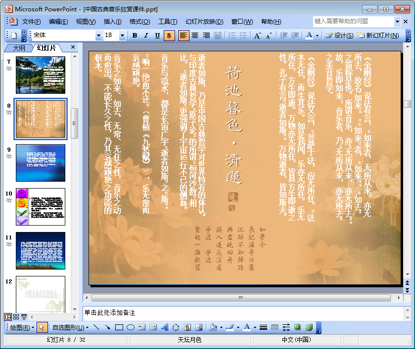 关于中国的古典音乐你了解多少呢?如果你的回答是“并没有多少”的话,那么不妨随小编一起来看看这份优秀ppt欣赏之中国古典音乐欣赏课件吧!该ppt课件详细介绍了古筝、笛子、二胡、琵琶、大鼓等民族乐器演奏的中国古典名曲,感兴趣的朋友可以来了解一下!