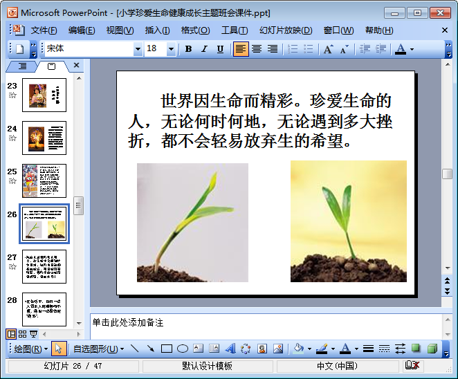 该小学珍爱生命健康成长主题班会课件ppt共由47页组成(以下简称为珍爱生命班会ppt),该ppt内容包含有很多充满趣味性和启发性的小故事,便于小学阶段的学生理解,如果你需要这份珍爱生命班会ppt的话只需轻轻点击本文相应的下载地址进行下载即可!