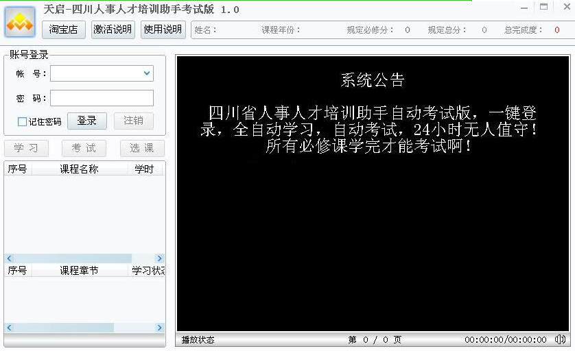 1、可以自动处理各种弹出窗口,自动回答问题。 2、必修课播放完成后可自动完成相应考试。 3、学习完一个课程可以自动跳转到下一课程学习。 4、播放时网络掉线可自动重登录,继续学习。 5、一台电脑上可同时登录多个帐号学习,但每个帐号必须激活。 6、播放时可设置声音开\关,可最小化播放,不影响工作。