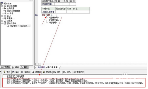 4、在子程序中 添加一条模块中的命令,如:“淘宝_登陆”(注意,只有加载这个模块后,命令才起作用),输入后可以展开所看到的,下面的状态栏还可以看到下面有说明提示。