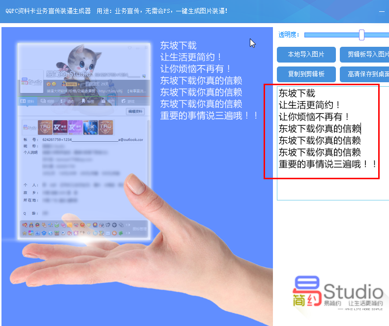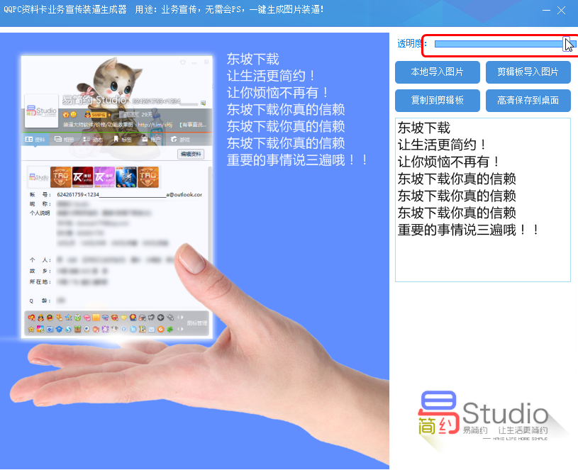 QQPC资料卡业务宣传装逼生成器说的简单点就是款适合大家高调装x的软件。不需要你懂任何技术,就可以在最短的时间达到最装逼的效果,而且不会让任何人看的出来,这个也还十分适合做QQ业务的小伙伴使用!