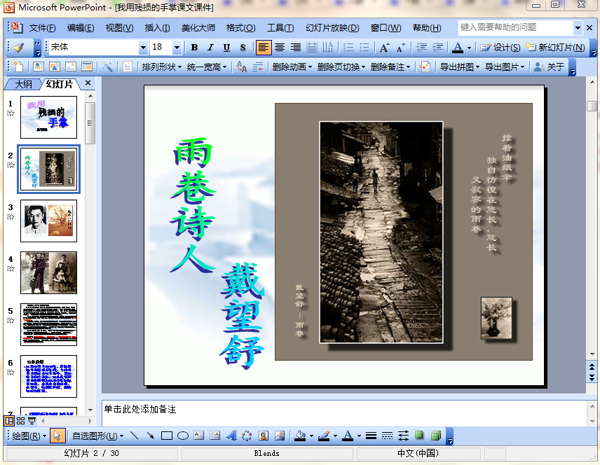 撑着油纸伞,独自彷徨在悠长、悠长又寂寥的雨巷,我希望逢着一个丁香一样地结着愁怨的姑娘。她是有丁香一样的颜色,丁香一样的芬芳,丁香一样的忧愁,在雨中哀怨,哀怨又彷徨;她彷徨在这寂寥的雨巷,撑着油纸伞像我一样,像我一样地默默行着冷漠、凄清,又惆怅。她默默地走近,走近,又投出太息一般的眼光