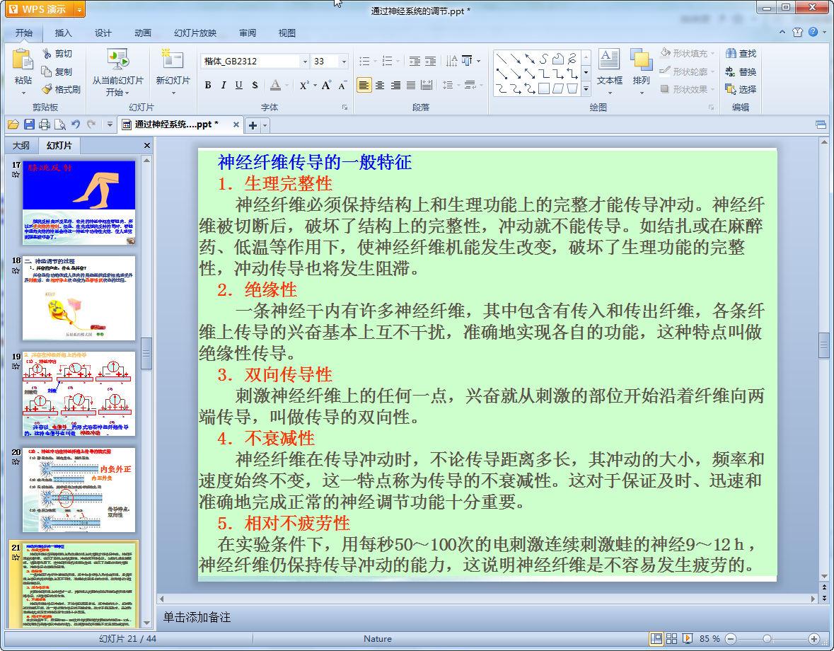 在实验条件下,用每秒50~100次的电刺激连续刺激蛙的神经9~12h,神经纤维仍保持传导冲动的能力,这说明神经纤维是不容易发生疲劳的。