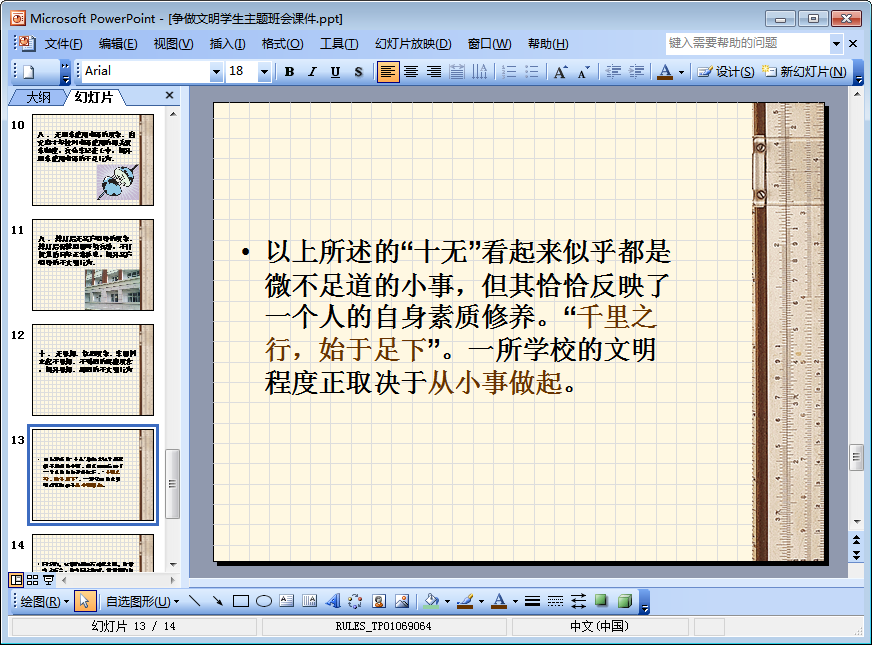 以上所述的“十无”看起来似乎都是微不足道的小事,但其恰恰反映了一个人的自身素质修养。“千里之行,始于足下”。一所学校的文明程度正取决于从小事做起。