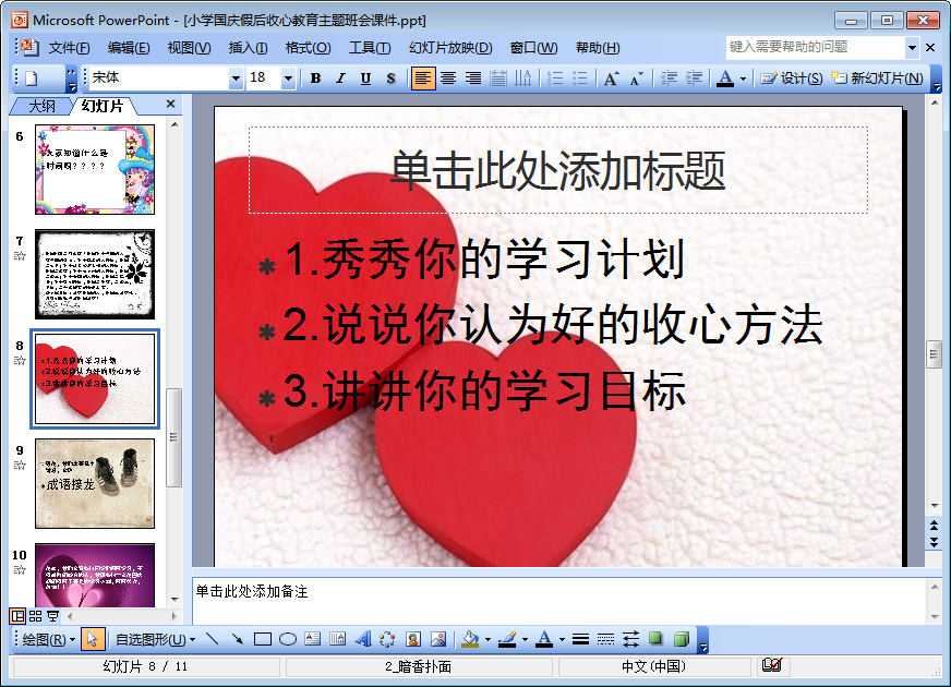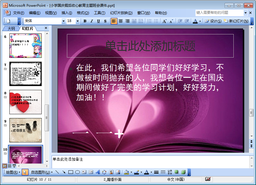 国庆七天假已经结束了,但不少学生依旧没有把心收回放在学校学习上——那么此时应该怎么办呢?没错!是时候由班主任老师出马,为学生们召开一次国庆假后收心教育主题班会了。本节内容东坡小编为大家整理带来的是一份由11页组成的小学国庆假后收心教育主题班会ppt课件(以下简称为小学生收心教育ppt),希望对大家有所帮助!