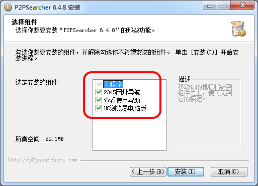 1、下载安装p2psearcher,注意,不要一直点击下一步,可以去掉广告推广程序,省去不少麻烦