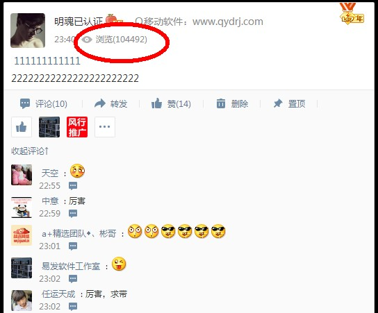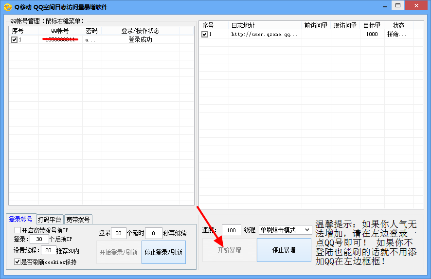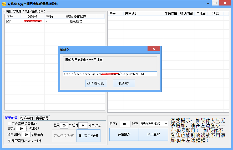 Q移动QQ空间日志访问量暴增就是刷QQ日志人气的软件,然并卵!软件两个用途:第一装逼用!第二:诱惑用户,误以为自己空间很高人气,诚信度高!软件是完全免费的,多线程快速刷日志人气,数万访问量轻轻松松,需要的朋友可以下载试试哦!
