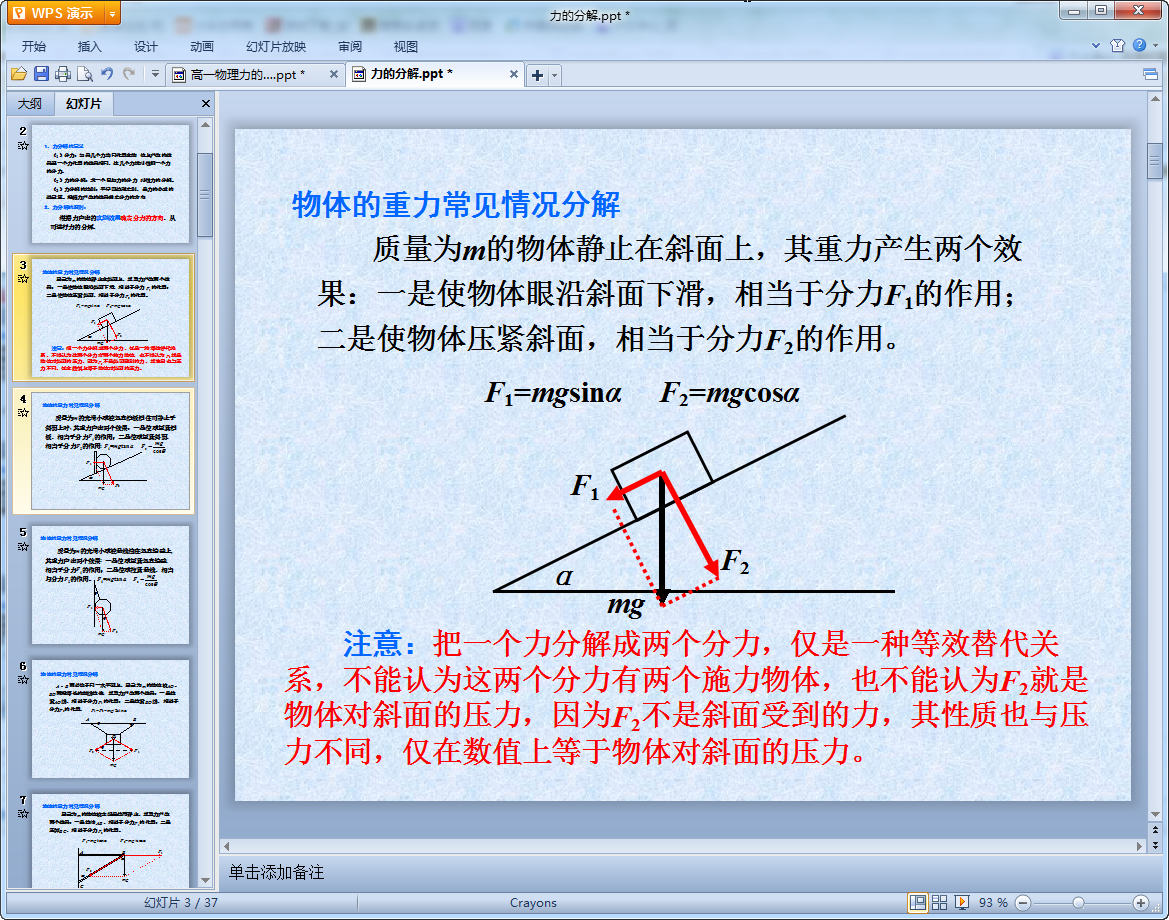 注意:把一个力分解成两个分力,仅是一种等效替代关系,不能认为这两个分力有两个施力物体,也不能认为F2就是物体对斜面的压力,因为F2不是斜面受到的力,其性质也与压力不同,仅在数值上等于物体对斜面的压力。
