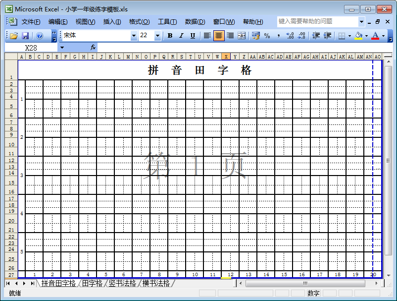 这份excel免费版小学一年级练字模板中共包含有四种练字模板表格,分别为拼音田字格、田字格、竖书法格、横书法格,这些表格排版规范,均可以下载下来进行打印使用,如果你需要这份齐全的一年级练字模板,只需轻轻点击本文相应的下载地址进行下载即可!另外,本站还有 doc格式word版一年级上册田字格练字模板等多种练字表格模板可供大家选取使用,欢迎有需要的朋友们前来下载!