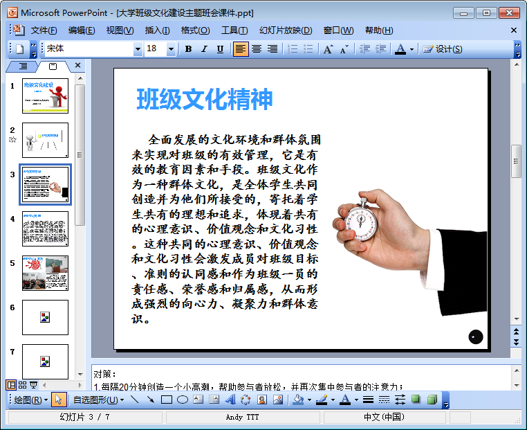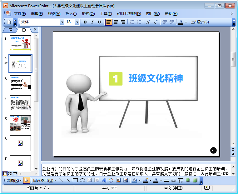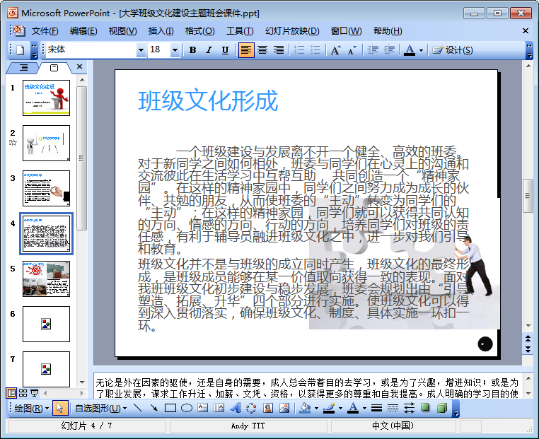 这份大学班级文化建设主题班会课件ppt尽管只有7页,但其中的内容却是十分完整全面,ppt详细介绍了班级文化精神以及班级文化形成等,下文是该班级文化建设ppt的内容摘选及预览图,想要查阅该ppt全部内容的朋友们只需轻轻点击本文相应的下载地址进行下载即可!