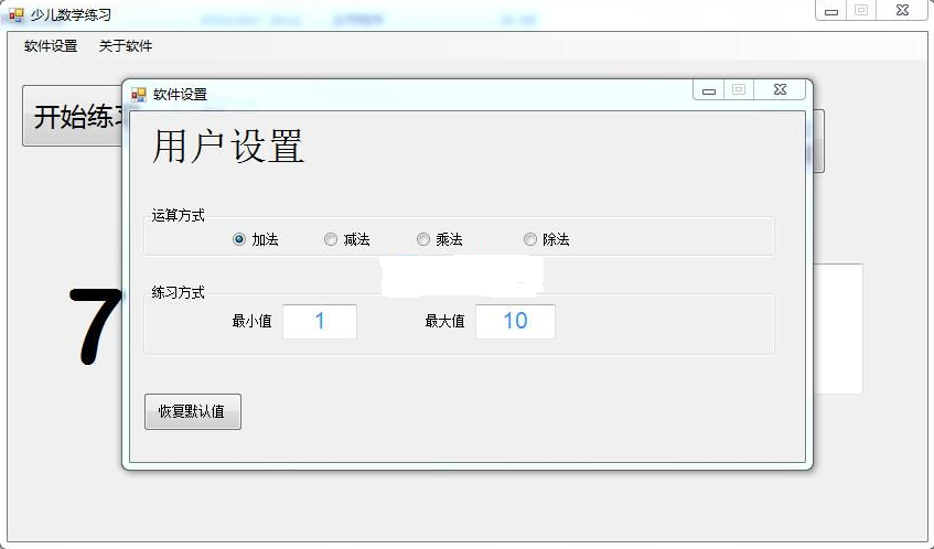 国庆期间,刚好可以给宝宝在闲的时间巩固一下学的数学计算。由于1到10的加减法运算感觉很重要,于是写了一个小软件,专门给宝宝练习,因此默认设置是1到10的加法,在软件可以进行设置。软件功能不多,但暂时感觉够用,以后若再有时间,可能会再优化一下。