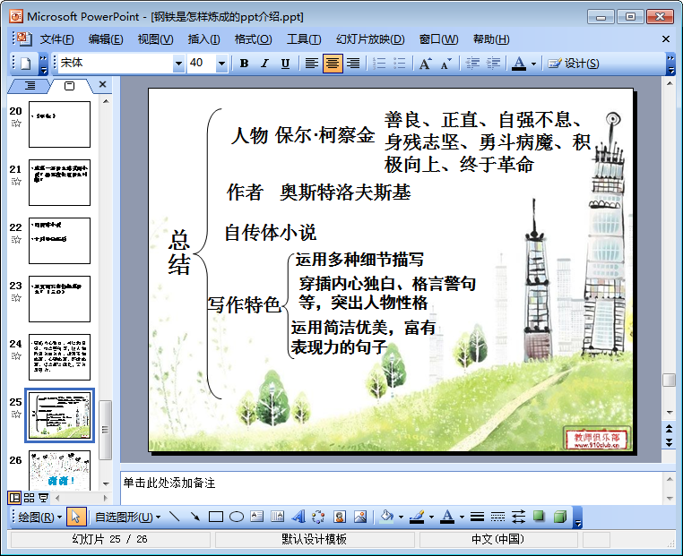 如果说钢铁是怎样炼成的一书是一本名著,应该没有多少人会否定吧?本节内容东坡小编为大家整理带来的是一份完全免费的介绍钢铁是怎样炼成的ppt,该ppt共26页,内容详细介绍了该书的作者及内容,十分具有可读性和参考价值,建议有需要的朋友们下载下来进行完整阅读!