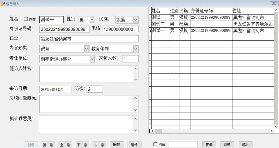 录入模块是根据实际工作进行的设计,十分简便自动。录入时如有重名自动提示是否重访,并提取原数据,由操作者选择是或否再进行下一步编辑;身份证号码项则自动判断校验;在单位局域网中进行协同工作。