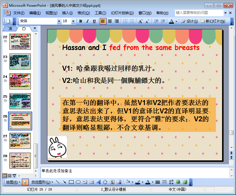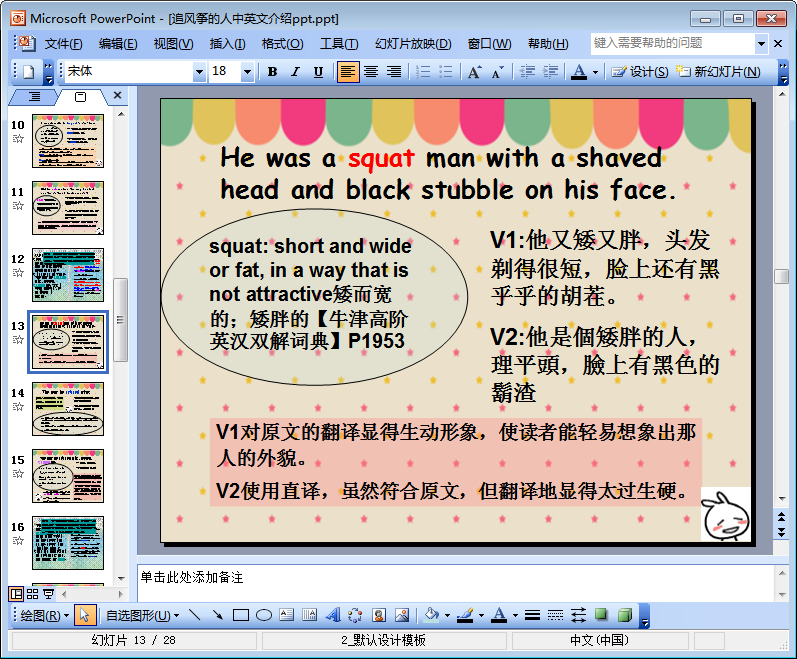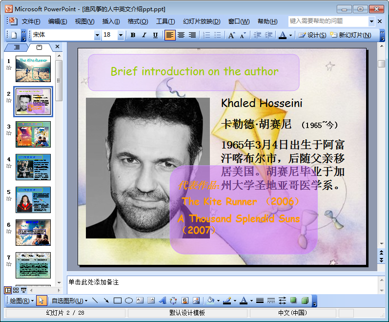 尽管从内容上看,这份ppt似乎在讨论关于追风筝的人这本书的一些翻译问题,但细心的朋友一定会发现这份ppt其实已经将追风筝的人一书做了相关介绍了,比如作者、比如书中人物以及故事情节等,该追风筝的人中英文介绍ppt共28页,内容完全免费,欢迎有需要的朋友们前来下载!