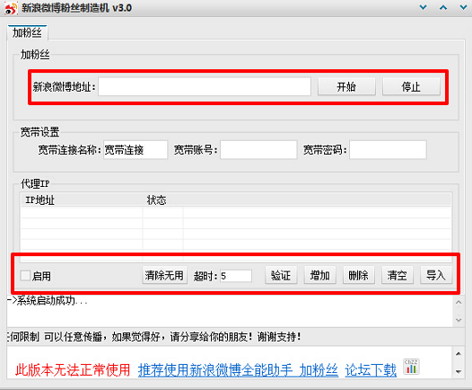 制造的粉丝有头像有资料有博文自有粉丝 它的粉丝也会增加 真实度99% 成功制造粉丝后自动加入网络后台 就算不在线不使用软件粉丝也会继续增加一段时间 长时间不输入验证码制造粉丝,增加粉丝将会停止 软件为免费软件,不需要任何费用,没有任何限制,放心使用!软件采用多线程 出验证码的时间更短 制造粉丝的速度更快。制造粉丝需要换IP,ADSL用户可以设置宽带帐号重拨号换IP,局域网用户可以设置代理IP,软件有验证代理IP有效性功能!提示,连续成功输入两种验证码制造一个粉丝,输完后延迟一小段时间即会提示成功制造一个粉丝。