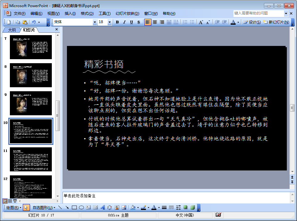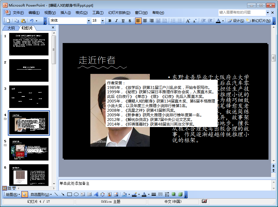 该嫌疑人X的献身书评ppt内容包含有走近作者、登场人物、图书简介、阅读建议、名篇佳句、读书笔记、精彩书摘、书评等部分,对嫌疑人X的献身一书做了详细的介绍,需要了解该书或是需要该书相关书评的朋友们可以了解一下!