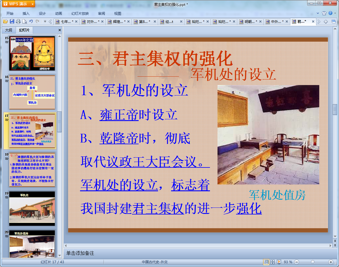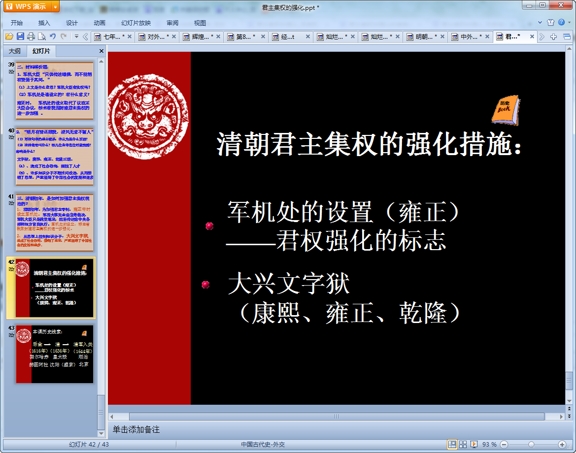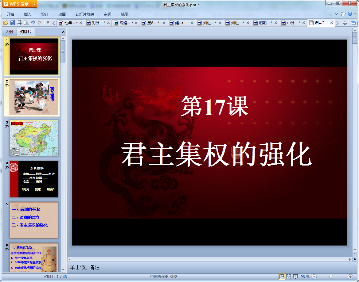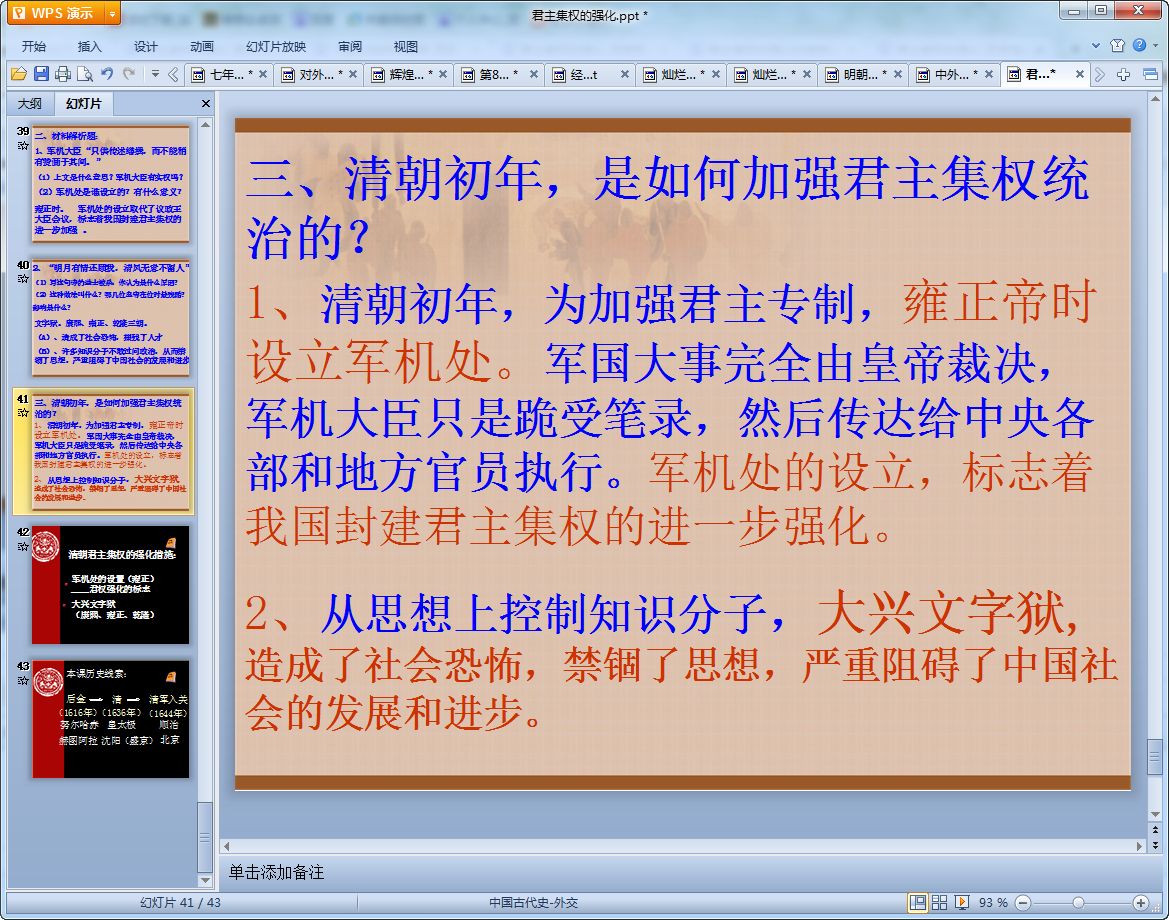 这是一篇由东坡下载站编辑整理的初中历史君主集权的强化教学课件,讲述了我国封建君主集权的强化过程在清朝达到巅峰,课件共有43页配有大量图片内容丰富,知识点概括全面,有需要的朋友们可以来看看,我们为大家提供免费的下载!