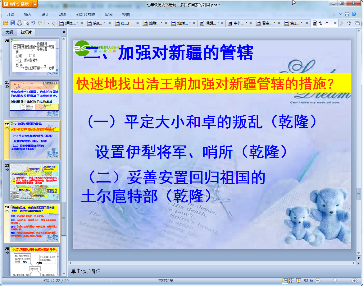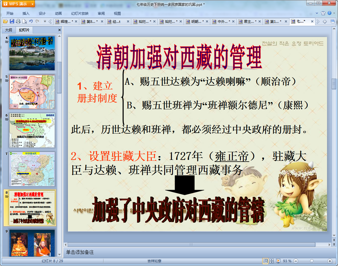 这是一篇七年级历史教学课件统一多民族国家的巩固ppt,该课件共有29页讲述了我国清朝前期对维护统一多民族国家采取的一系列措施,知识点讲解的十分清楚,非常不错的教学课件,有需要的老师们可以来下载使用!