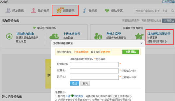 1、进入QQ空间->音乐->背景音乐->添加网络背景音乐;