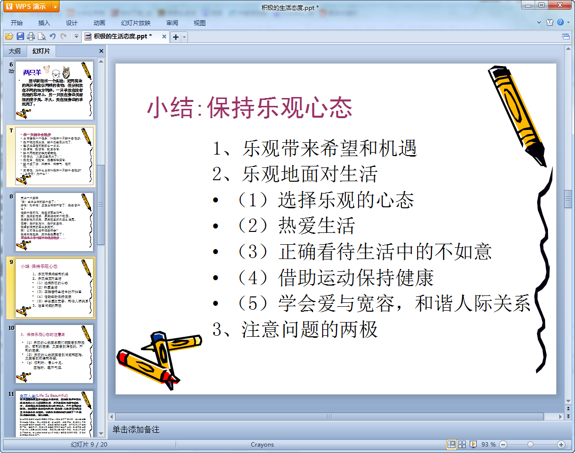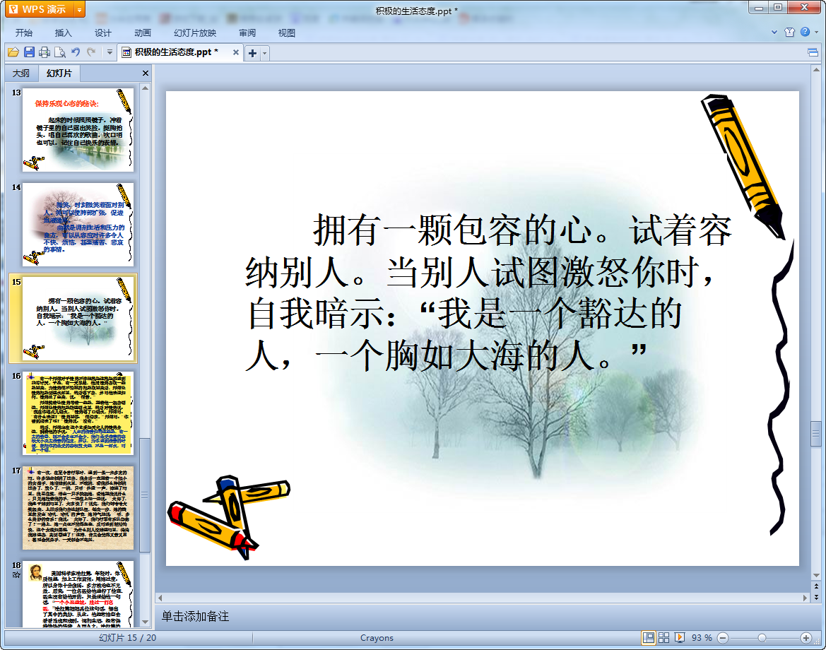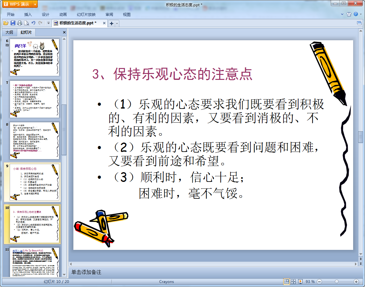 这是一篇教学课件积极的生活态度ppt,该ppt共有20页制作十分精细内容取材丰富,非常不错的一篇ppt课件,可以让学生们正确的对待学习以及生活中遇到的各种难题,非常不错的一篇教学课件,有需要的老师同学们可以来下载!