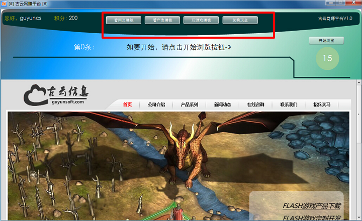 古云网赚平台V1.0正式推出,注册用户登陆后,可以通过浏览各种广告、推广网页、玩游戏等方式获得积分奖励,当积分到达一定数额,即可申请兑现现金。请注意,在注册用户信息的时候,信息一定要填写完整,以免现金发放错误!