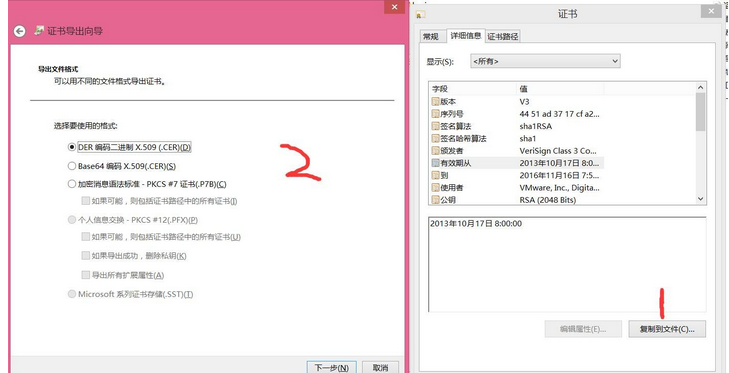 已VM软件的安装包为例,打开应用程序“属性”,依次选择“数字签名→详细信息→查看证书→详细信息→复制到文件”,按照向导导出数字证书